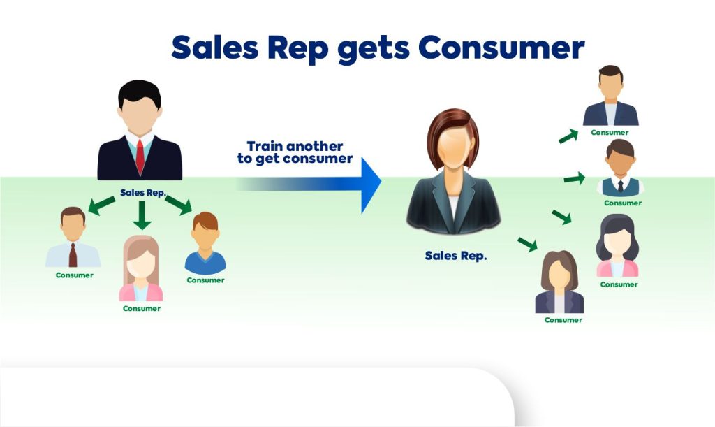 An MLM (Multi Level Marketing) company “starts” by recruiting one person who gets customers and recruits sales reps (just as above in the traditional company). But each sales rep is also given the option to become a manager, who can also recruit sales reps as many as he or she can.